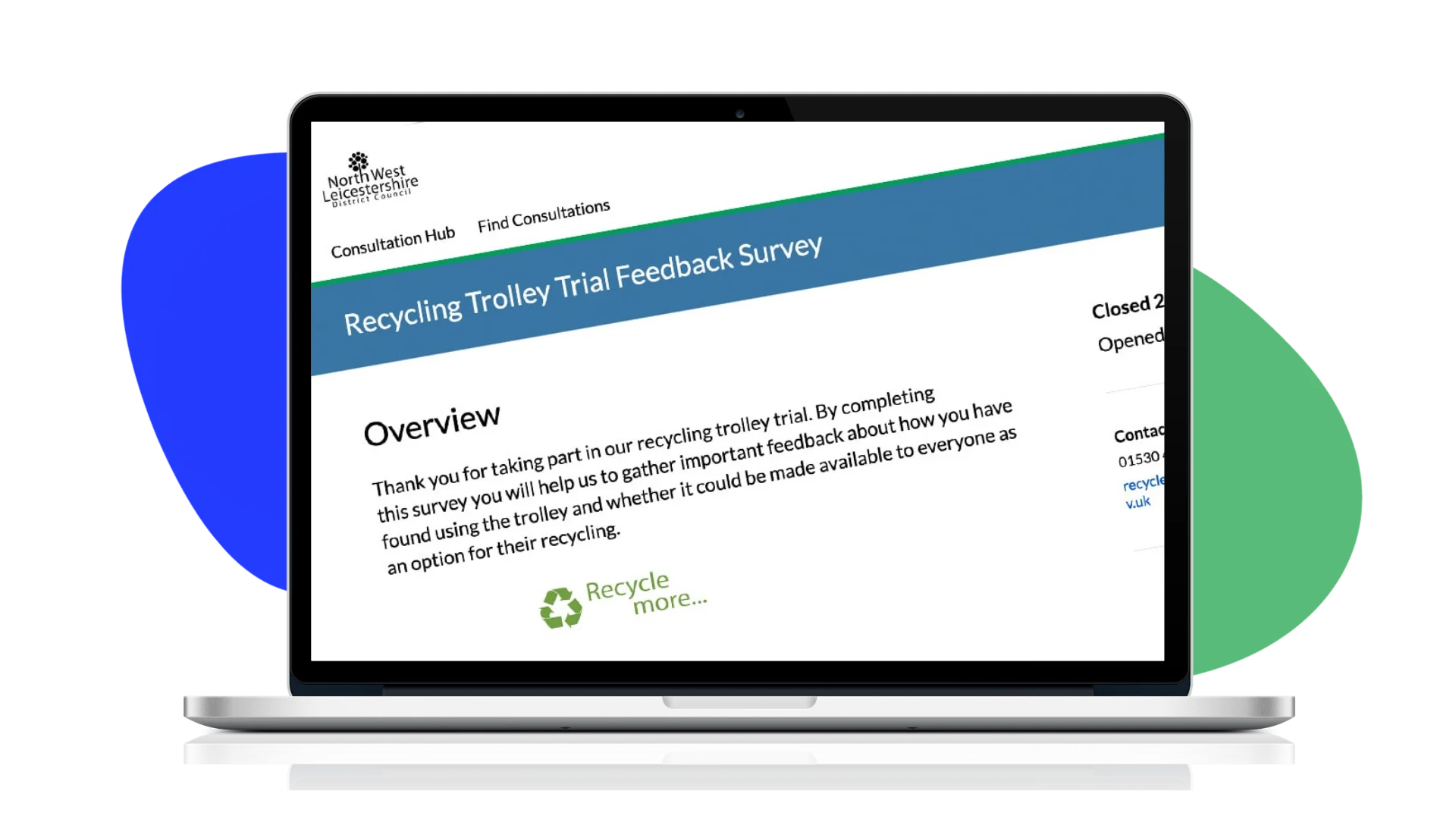 North West Leicestershire already used Citizen Space for their formal consultation and public involvement work, so extending it to gather feedback on the recycling pilot was a natural next step. They created a dedicated feedback survey using a mix of qualitative and quantitative questions alongside standardised demographics, giving residents a simple and convenient way to share their views from home, on their own terms and in their own time. The platform's flexibility made it straightforward to present the feedback form as distinct from a formal consultation process, while its built-in analysis and reporting tools made collating and acting on the results significantly easier for the council team.