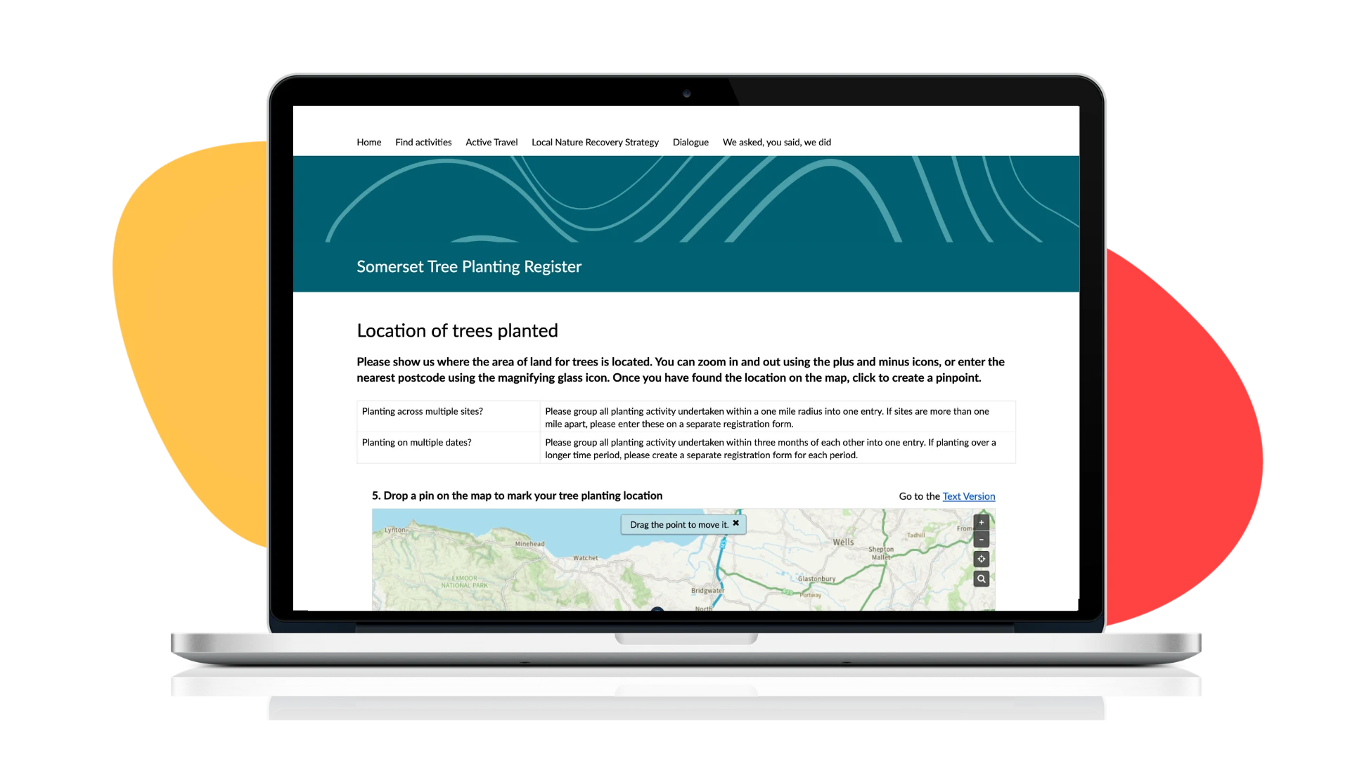 Somerset Council used Citizen Space Geospatial to build an interactive tree planting map, open to anyone across the county who is involved in planting trees or hedgerows. The activity invites residents, organisations, farmers and community groups to register their planting by dropping a pin on a map to mark the location of their trees, grouping nearby sites and planting periods into single entries to keep the data clean and manageable.