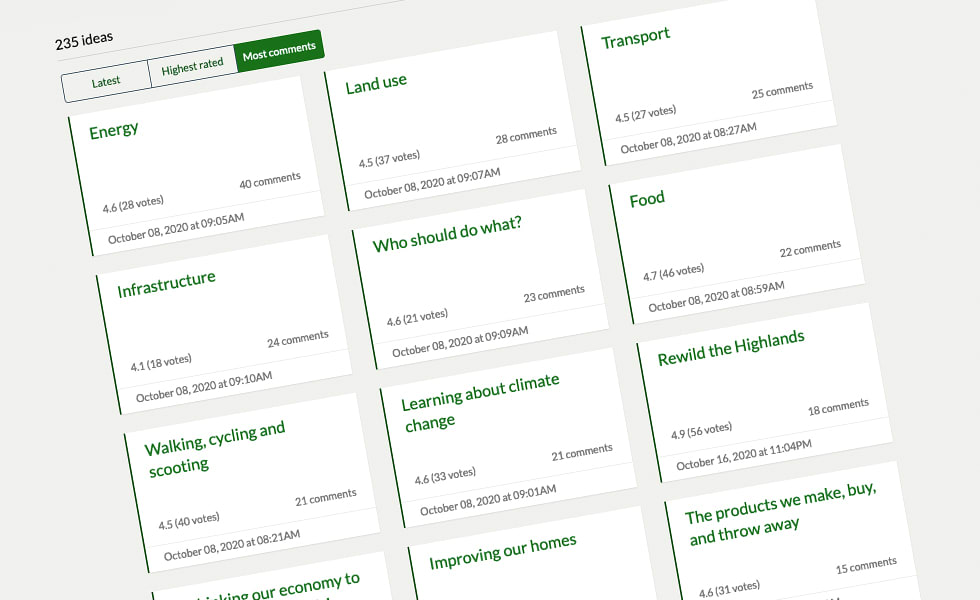 The Scottish Climate Assembly team pre-seeded a few ideas to kick off the conversation, and by the time the challenge had closed there were 235 ideas and hundreds of comments. Ideas were well-informed and highly considered, with thoughtful comments in both English and Gaelic.