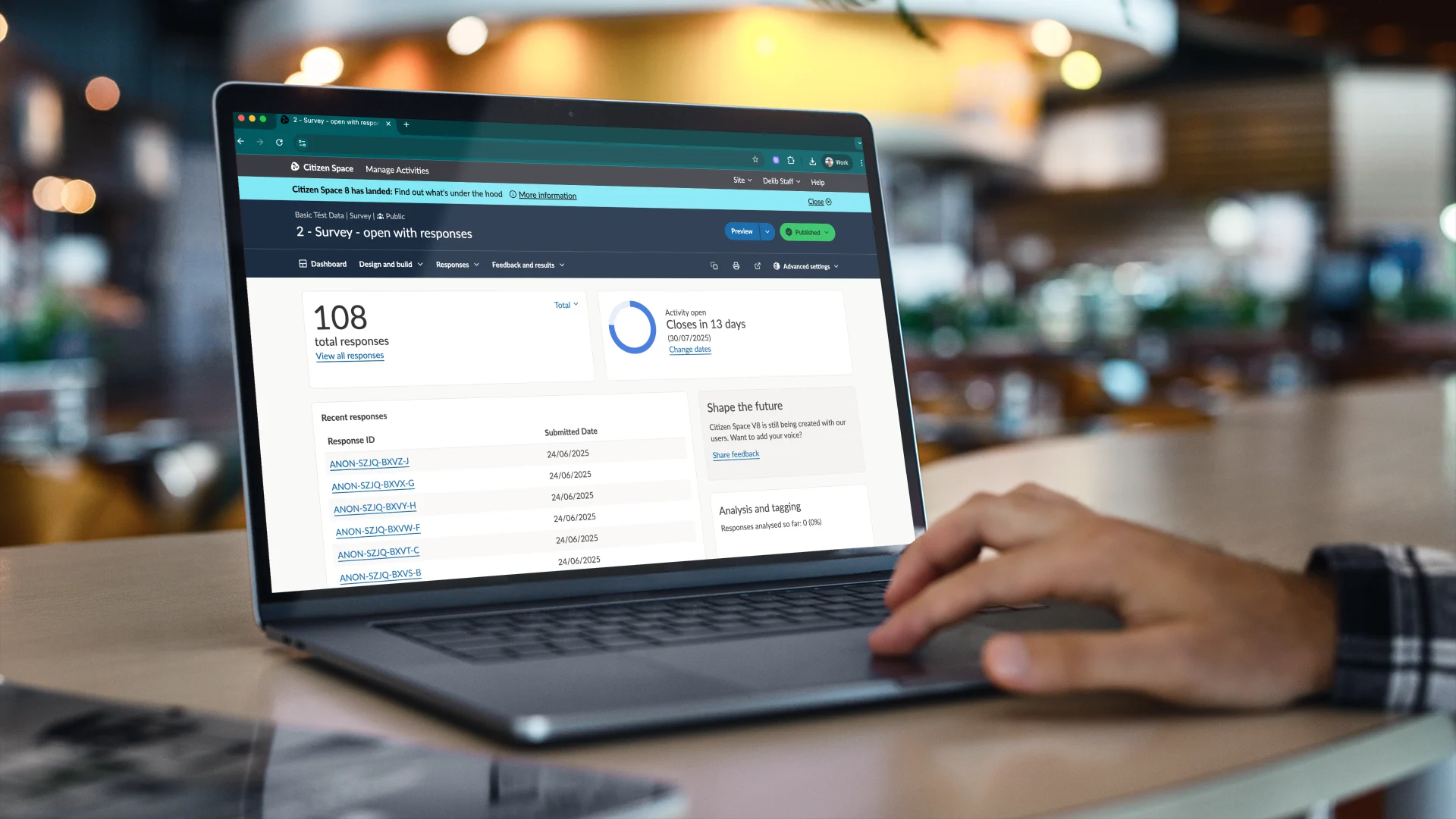 Citizen Space 8 represents more than technical improvements, it’s about creating a platform that adapts to your evolving needs. From the architectural changes that enable rapid customisation to the user experience refinements that save you time every day.