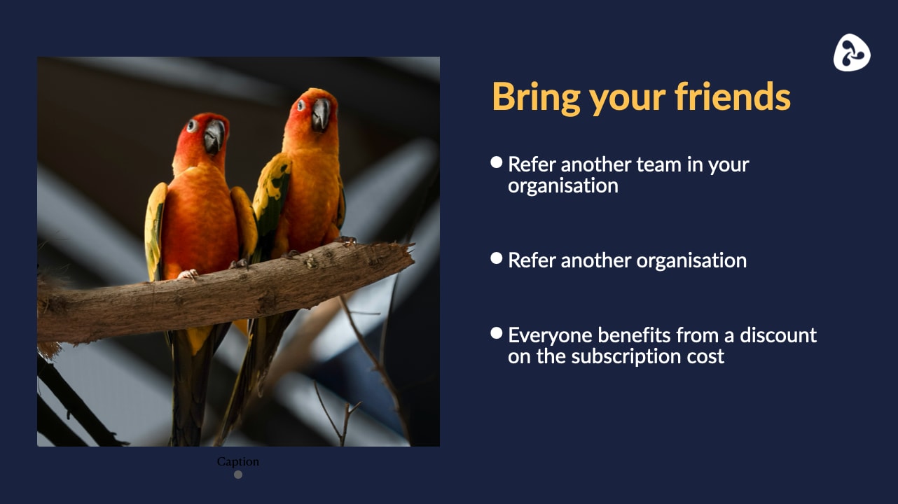 (This section of the blog could also feasibly have been titled "Blackbird" since Jessie's presentation slides were adorned by a variety of different feathered friends! The below slide refers to Delib's newly introduced referral scheme, which offers a subscription discount for any customer who introduces Citizen Space to a new team or other organisation.)