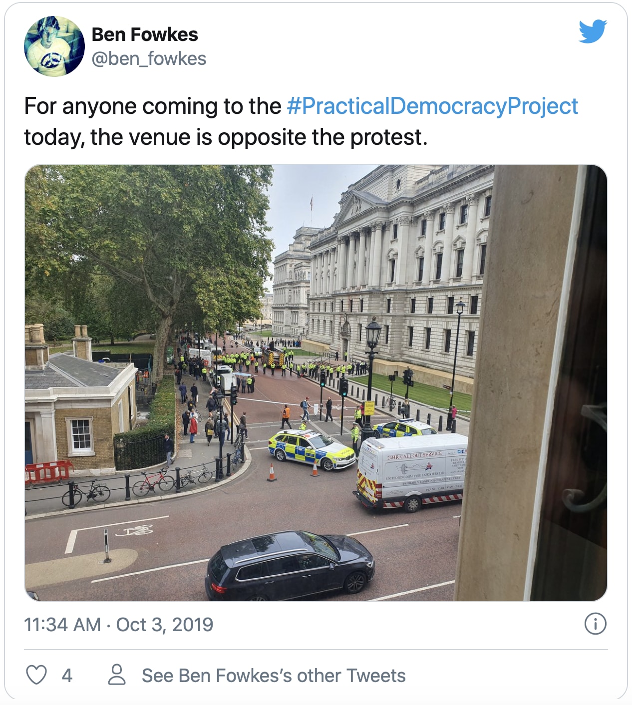 While we were setting up for PDP #9 in Westminster, Extinction Rebellion sprayed fake blood all over the Treasury and a number of innocent bystanders just across the street. The botched moment of protest, during which rebels lost control of the fire hose and got several people (themselves included) absolutely drenched in red dye, felt oddly significant as we prepared for an event themed around the state of modern democracy. (Can't quite put my finger on why.)