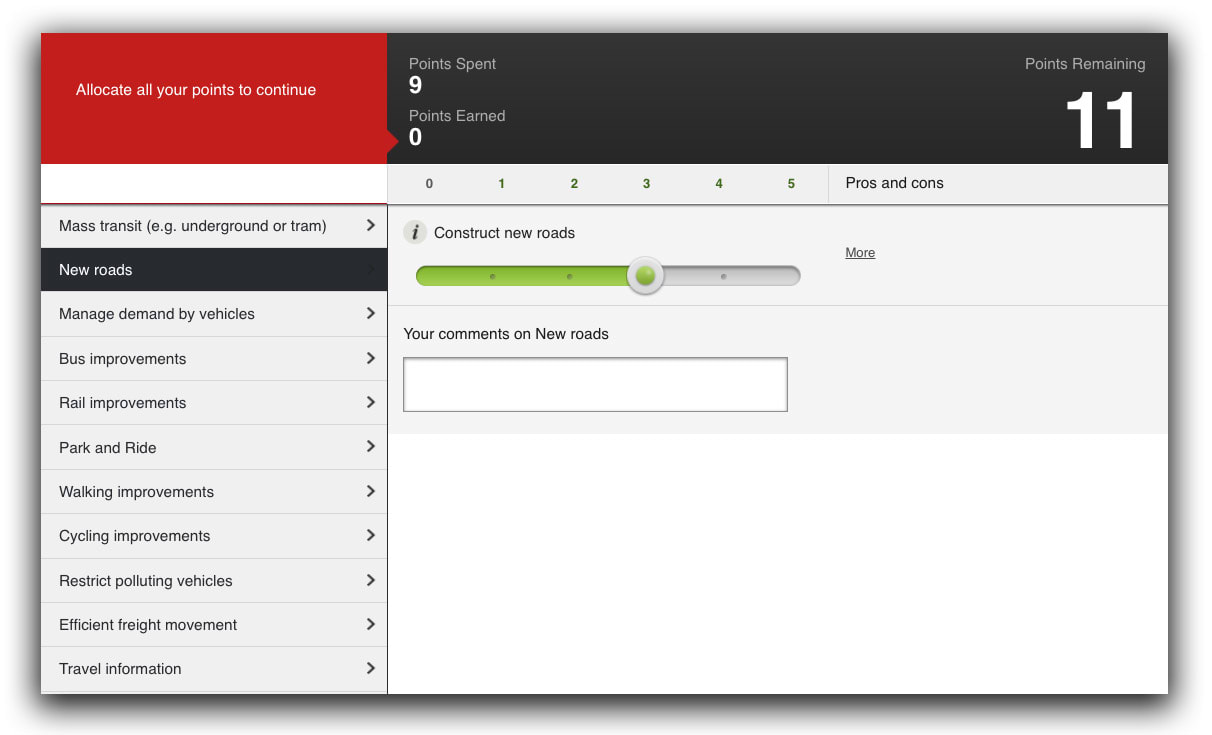 Respondents move sliders to the left or right to allocate points to areas they consider a priority. As they do so, they are given information on what the consequences for their choices might be in a real-life setting. This interactive model simulates trade-offs that planning, transport and environment officers need to consider before implementing decisions - for example, more cycle lanes might reduce road area for cars, resulting in more vehicle congestion in certain areas.
