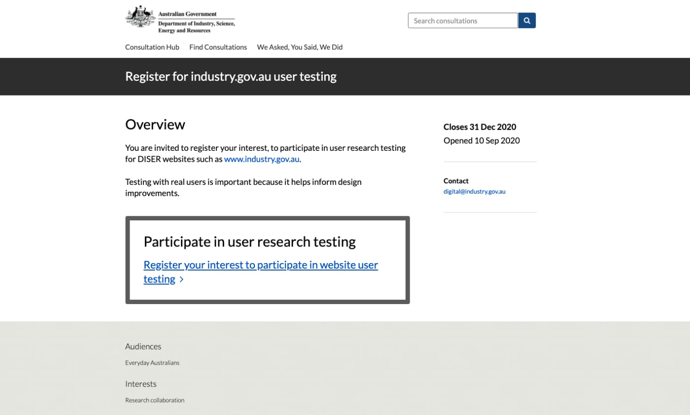 This is another use case that would ordinarily be carried out by using an off-the-shelf survey tool, so organisations can save a lot of money on licenses by using Citizen Space instead. Got an event coming up? Get people signed up or, in the case of the Australian Department of Industry, Science, Energy and Resources, register interest for taking part in user research testing.