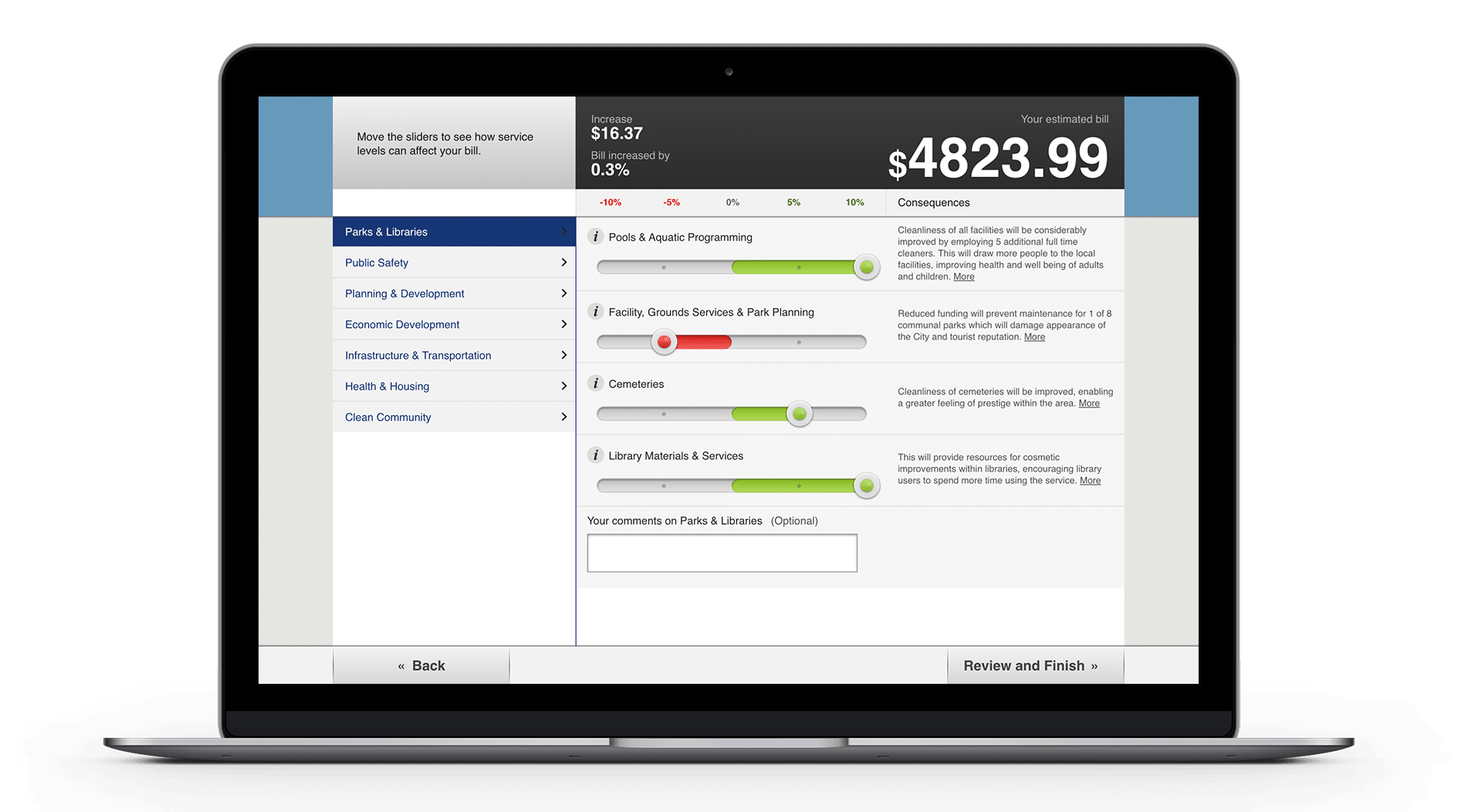 By increasing, decreasing or leaving services the same, participants are able to see in real time the impact of their decisions on their specific property tax bill.