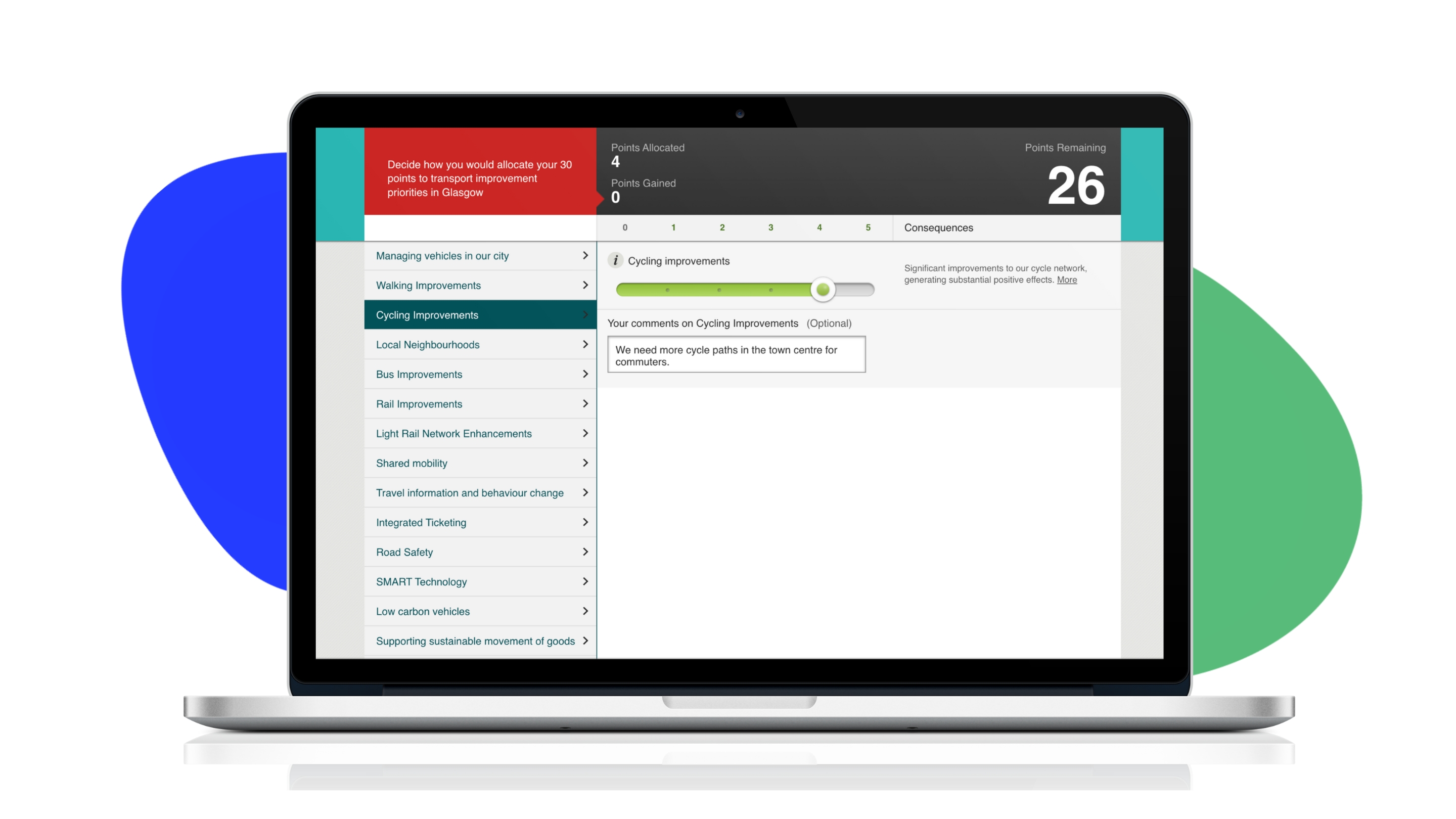 Glasgow City Council divided their 10-year transport plan into 15 categories and gave respondents 30 points to allocate. Each time someone adjusted a slider, they saw the likely impact of their decision. As Glasgow explained: